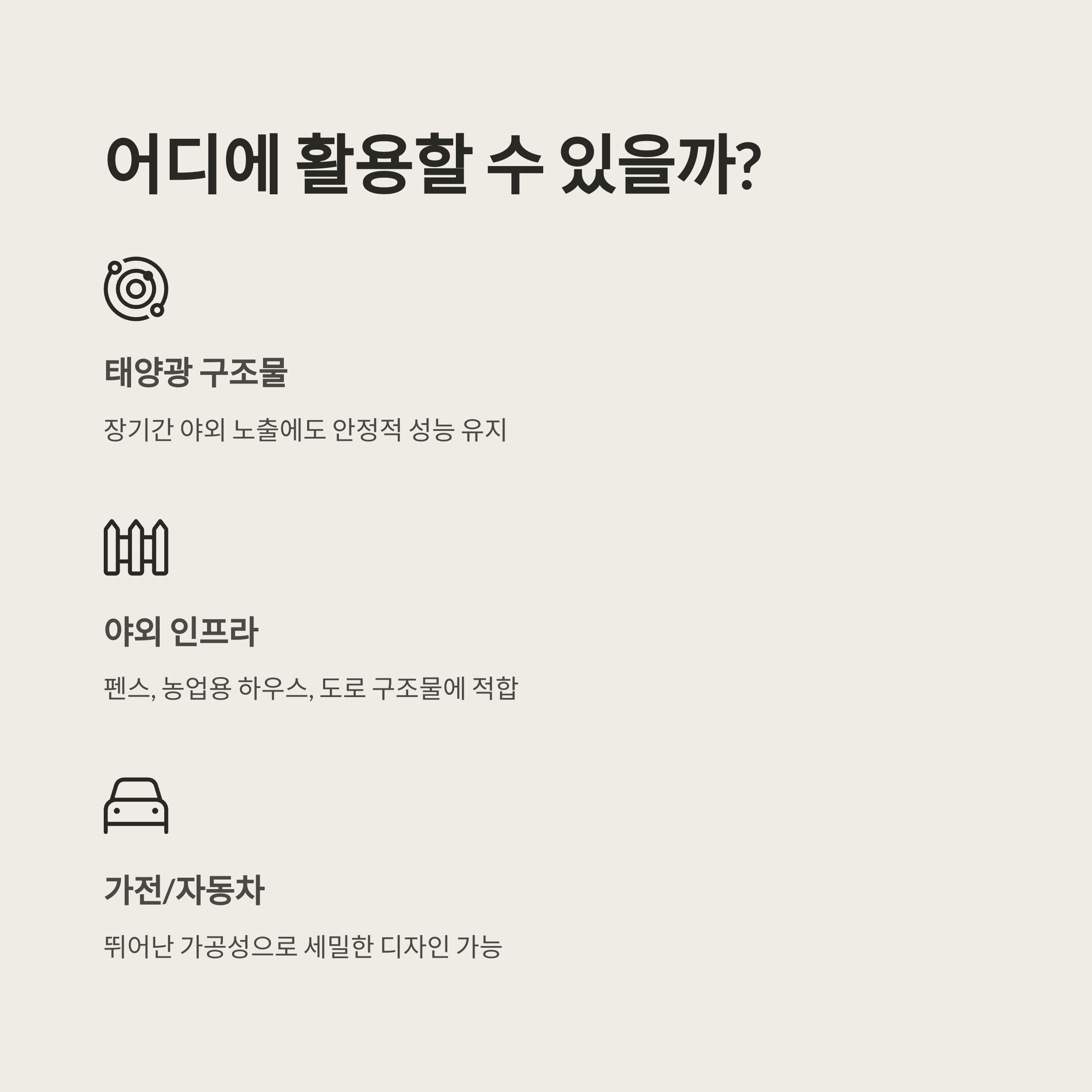 장기간 우천, 자외선, 염해 환경을 견뎌야 하는 구조물 조건에 잘 부합하기 때문에 태양광 산업 외에도 철제 펜스, 농업용 하우스 구조물, 도로 구조물 등 다양한 야외 인프라에 적합하다는 평가를 받고 있어요. 게다가 POSMAC은 높은 내구성과 절곡 가공성 덕분에 현장에서 유용하게 쓰이고 있어요.
