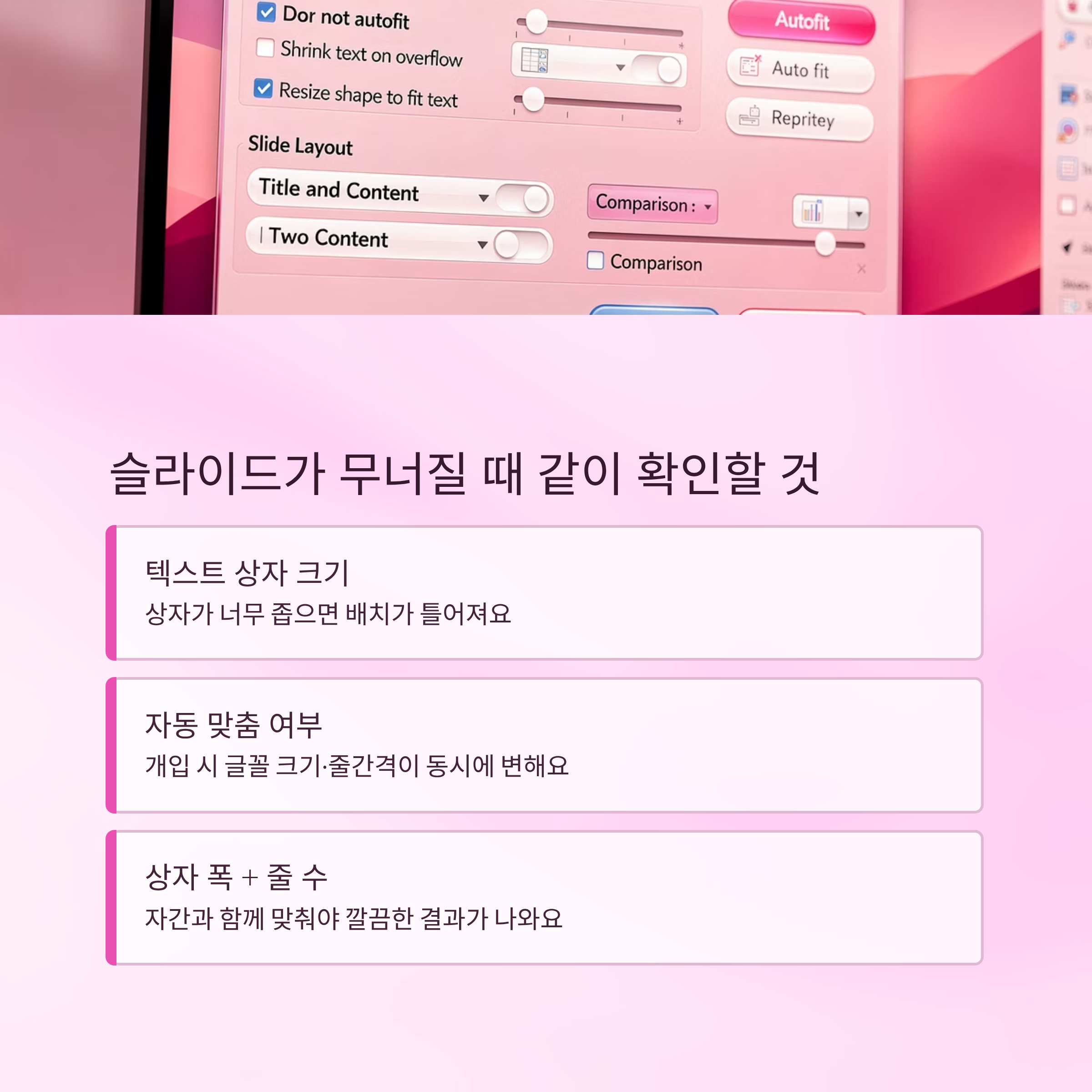 PPT자간줄이기를 했는데도 배치가 이상하면 텍스트 상자 크기와 자동 맞춤을 함께 확인해 보셔야 해요.
