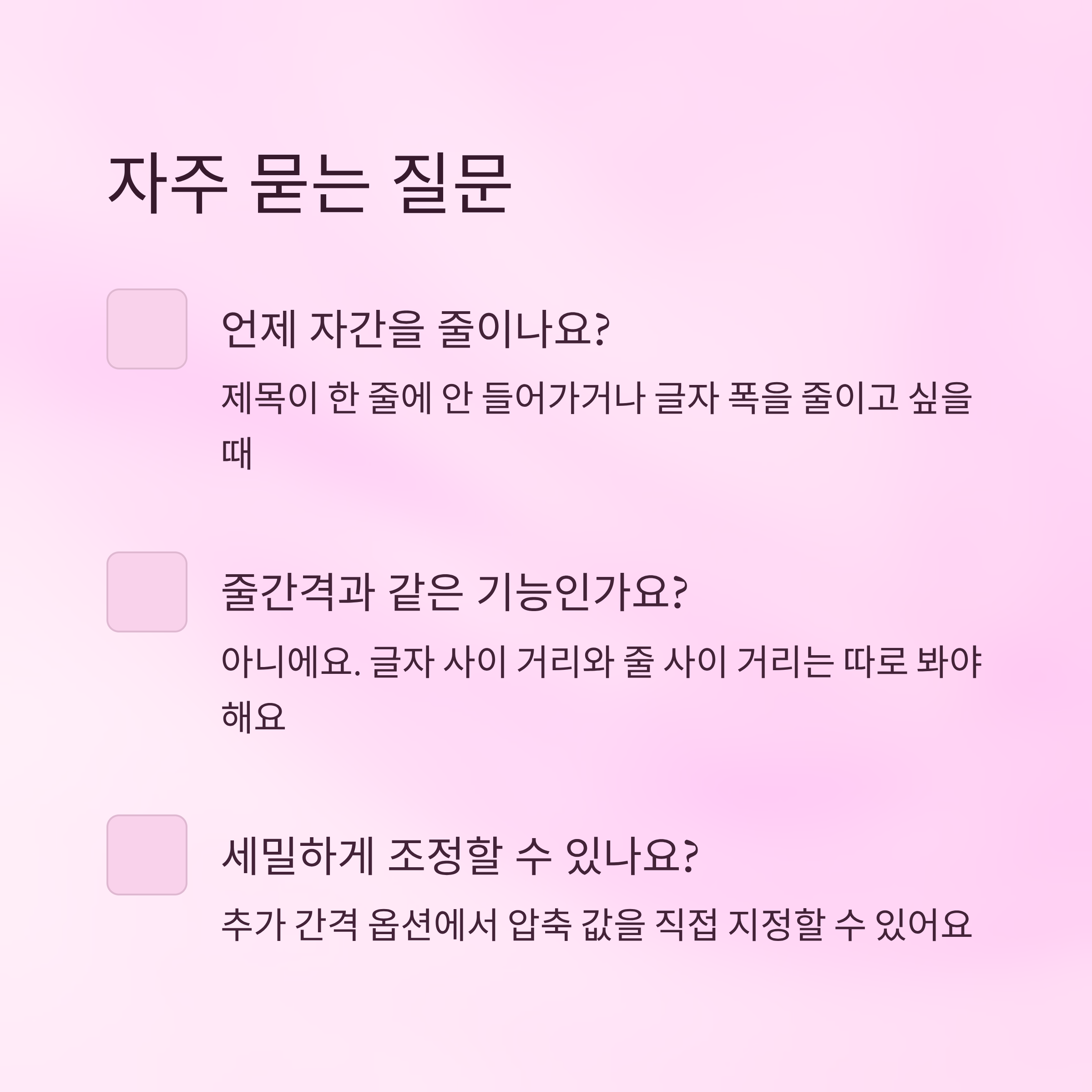 | 언제 자간을 줄이나요? | 제목이 한 줄에 안 들어가거나 글자 폭을 줄이고 싶을 때예요. |