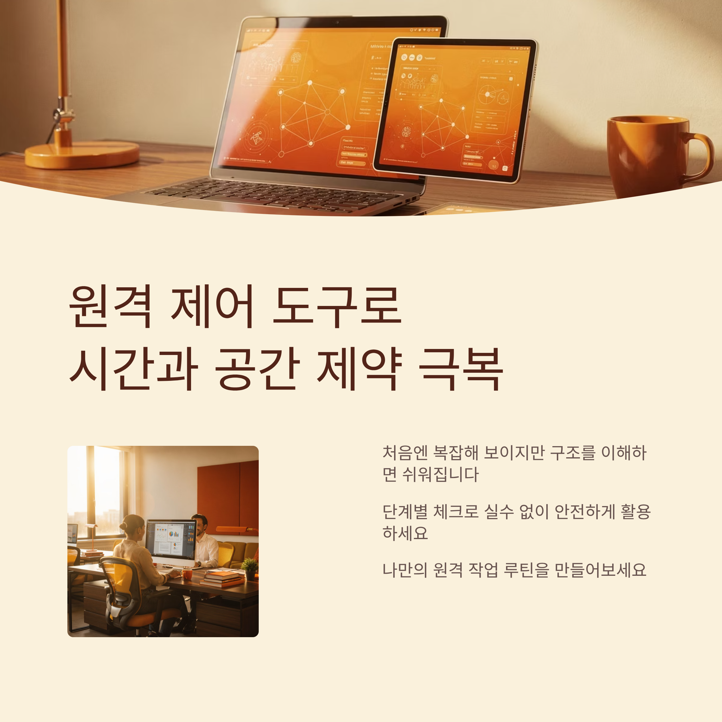 원격 제어 도구는 잘만 활용하면 이동 시간을 줄여 주고, 중요한 순간에 필요한 파일을 바로 꺼낼 수 있게 해 주는 든든한 도우미예요. 처음에는 설치와 보안 설정이 복잡하게 느껴질 수 있지만, 한 번 구조를 이해하고 나면 대부분 비슷한 흐름으로 이어지거든요. 오늘 정리한 내용을 바탕으로 각 단계에서 꼭 확인해야 할 것들만 체크해 보시면, 실수 걱정 없이 훨씬 편하게 쓰실 수 있을 거예요. 나중에는 본인 사용 환경에 맞는 작은 팁들을 조금씩 더해 가면서, 더 안전하고 효율적인 원격 작업 루틴을 만들어 보세요.