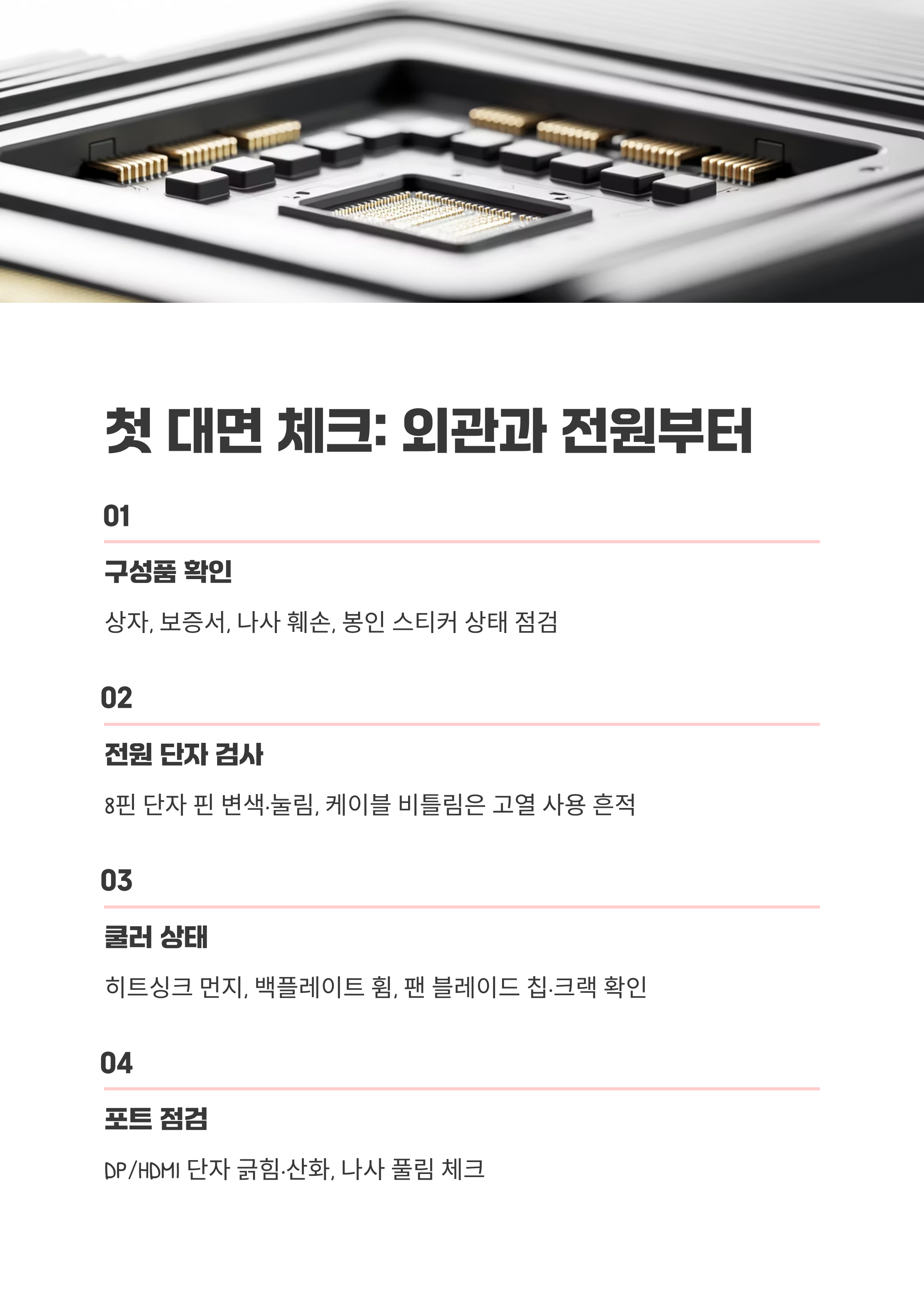 팬 블레이드 칩·크랙, 허브 유격을 손으로 아주 살짝 돌려 확인하고, 제자리로 부드럽게 돌아오는지 봅니다. 써멀패드 누유(기름 번짐)가 보이면 패드 경화 가능성이 높아요. 바꿔야 한다면 비용·시간을 가격 협상에 반영하세요.