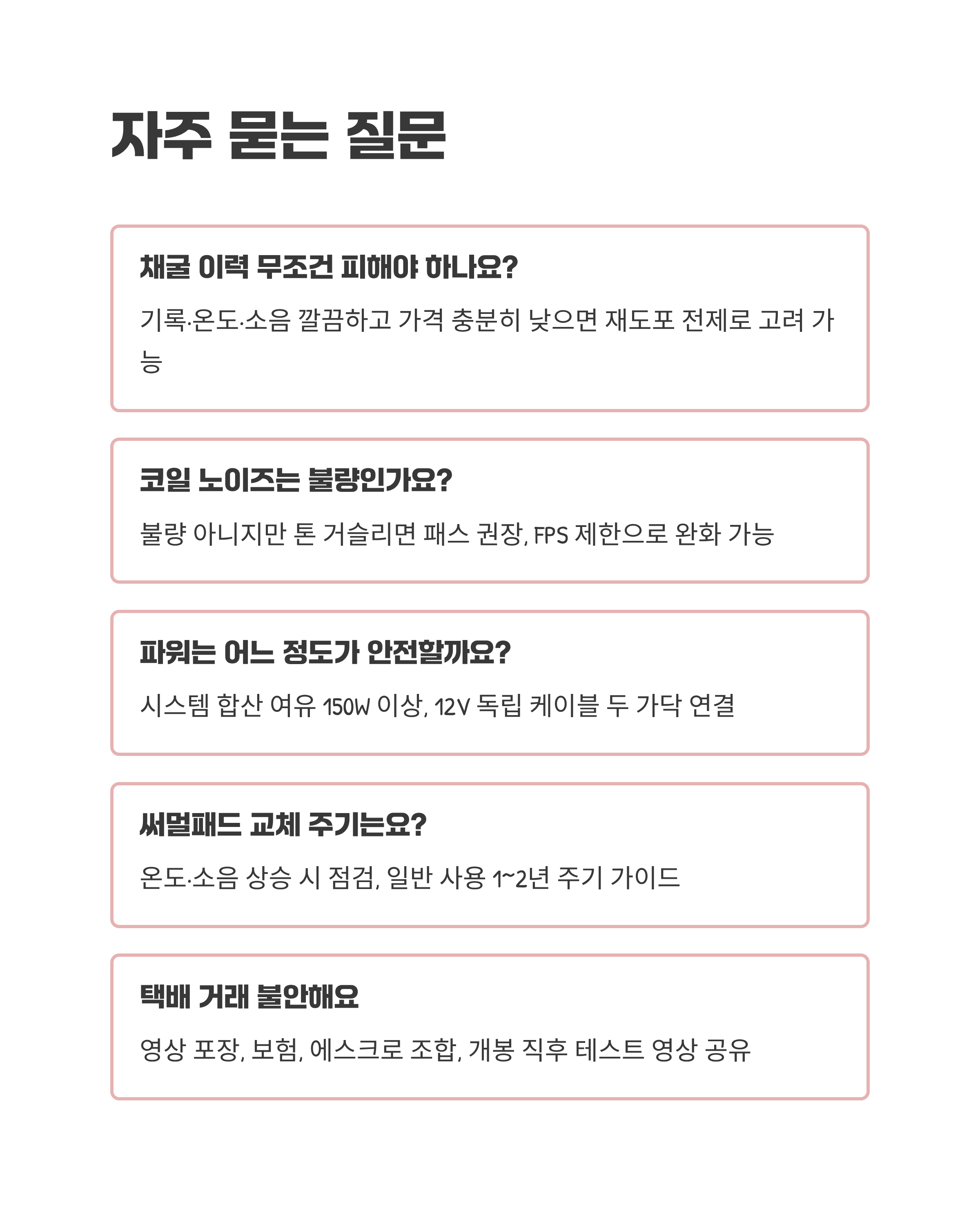 구매 직후 필수 비용(써멀/패드/청소, 택배 보험)을 합친 총비용(TCO)을 계산해 보세요. 직거래·택배의 위험도에 따라 보험·에스크로를 더하면 마음이 편해요. 구성품 완비·영수증 보유 매물은 프리미엄을 인정하되, 과하면 쿨하게 넘기세요.