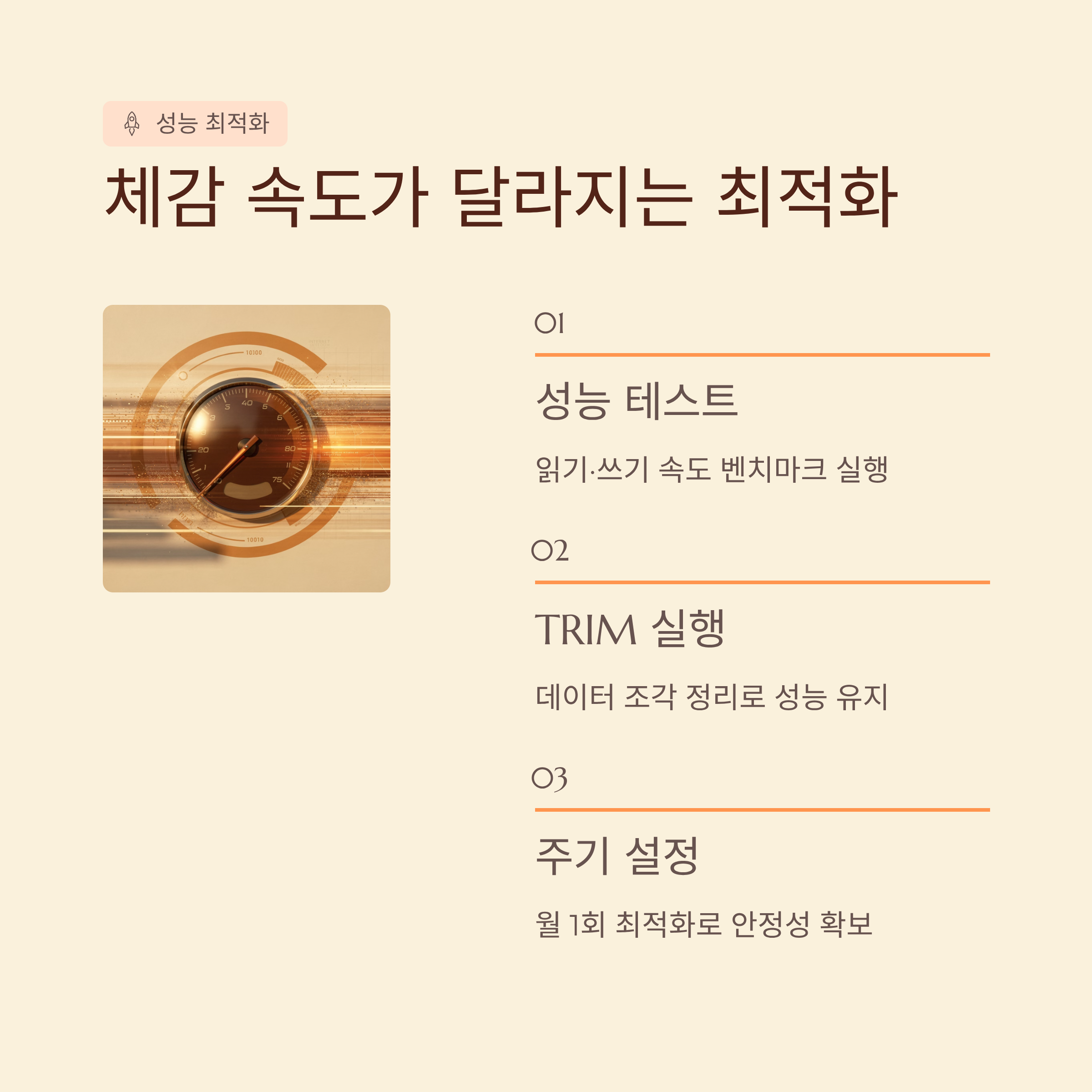 최적화 탭에서는 TRIM 명령 실행이나 여유 공간 정리 같은 기능을 제공하는 경우가 많아요. 이런 기능들은 데이터를 지우고 다시 쓰는 과정에서 쌓인 자잘한 조각들을 정리해 주는 역할이라, 주기적으로 사용하면 장기적인 성능 유지에 도움이 돼요.