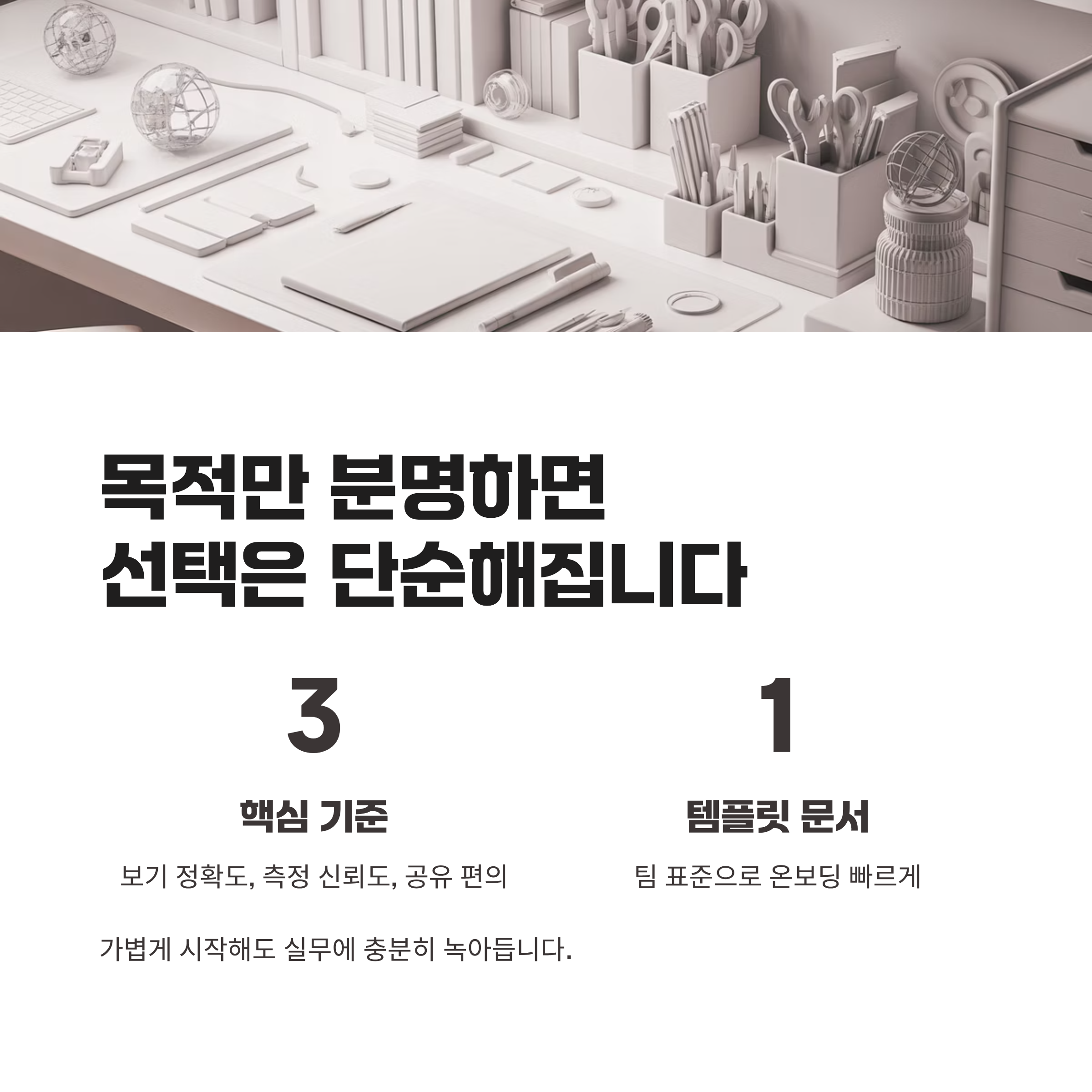 한 달 정도 쓰고 불편했던 점을 기록해 다음 분기에 대안을 비교해보세요. 핵심은 보기 정확도, 측정 신뢰도, 공유 편의예요. 팀 표준을 문서 한 장으로 남기면 신규 인원 온보딩도 빠르게 끝나요.