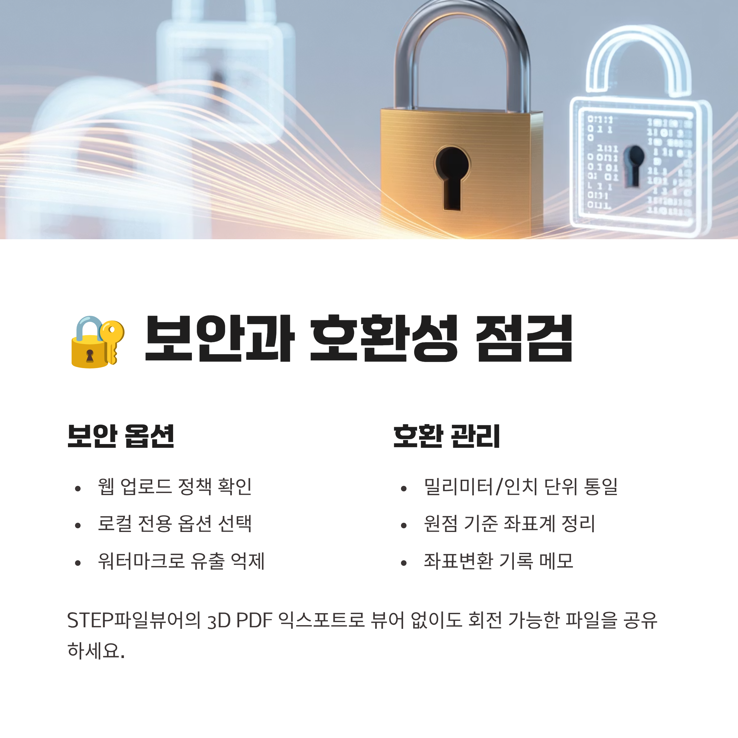 외부로 보낼 땐 파일이 어디에 보관되는지가 중요해요. 웹 업로드가 정책에 걸리면 로컬만 쓰는 옵션을 고르세요. 내보내기에서 스냅샷·3D PDF·중립포맷 중 무엇을 쓸지도 목적에 따라 달라져요. 3D PDF는 뷰어 없이도 회전이 가능해 설명이 쉬워요. 여기서 STEP파일뷰어의 워터마크 기능이 있으면 수신자 정보를 얹어 유출을 억제할 수 있어요.