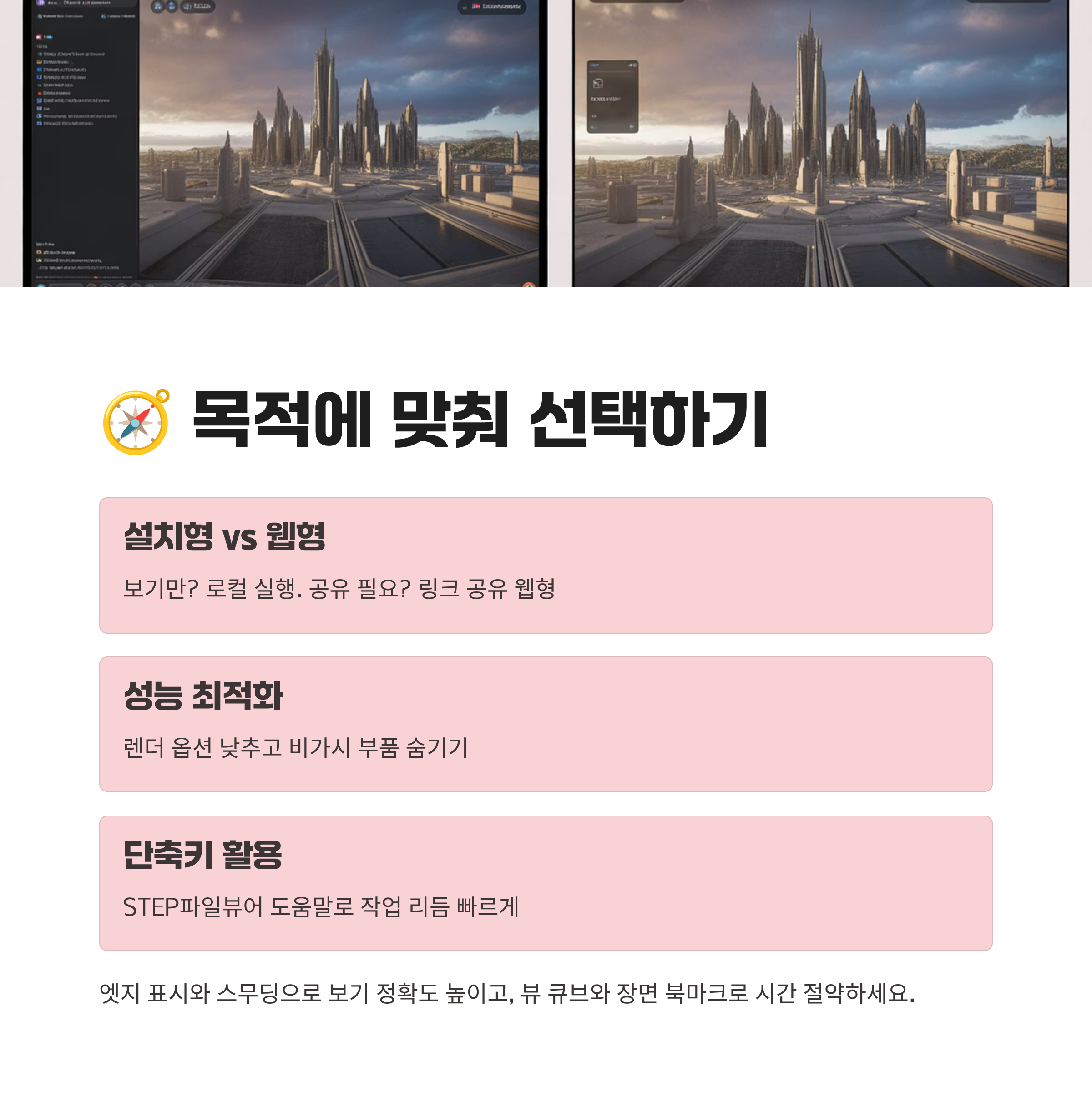 설치형과 웹형 중 무엇을 쓸지부터 정해보세요. 보기만 필요하면 로컬 실행이 빠르고, 외부와 의견을 주고받아야 하면 링크 공유가 쉬운 웹형이 편해요. 사양이 낮은 PC라면 렌더 옵션을 낮추고, 부품 수가 많은 어셈블리는 비가시 부품 숨기기를 자주 쓰면 체감이 좋아요. 이때 제품군별 샘플 파일을 한 번에 열어 성능을 가늠하면 좋고, 중간에 STEP파일뷰어가 제공하는 단축키 도움말을 띄워 손에 먼저 익혀두면 작업 리듬이 빨라져요.