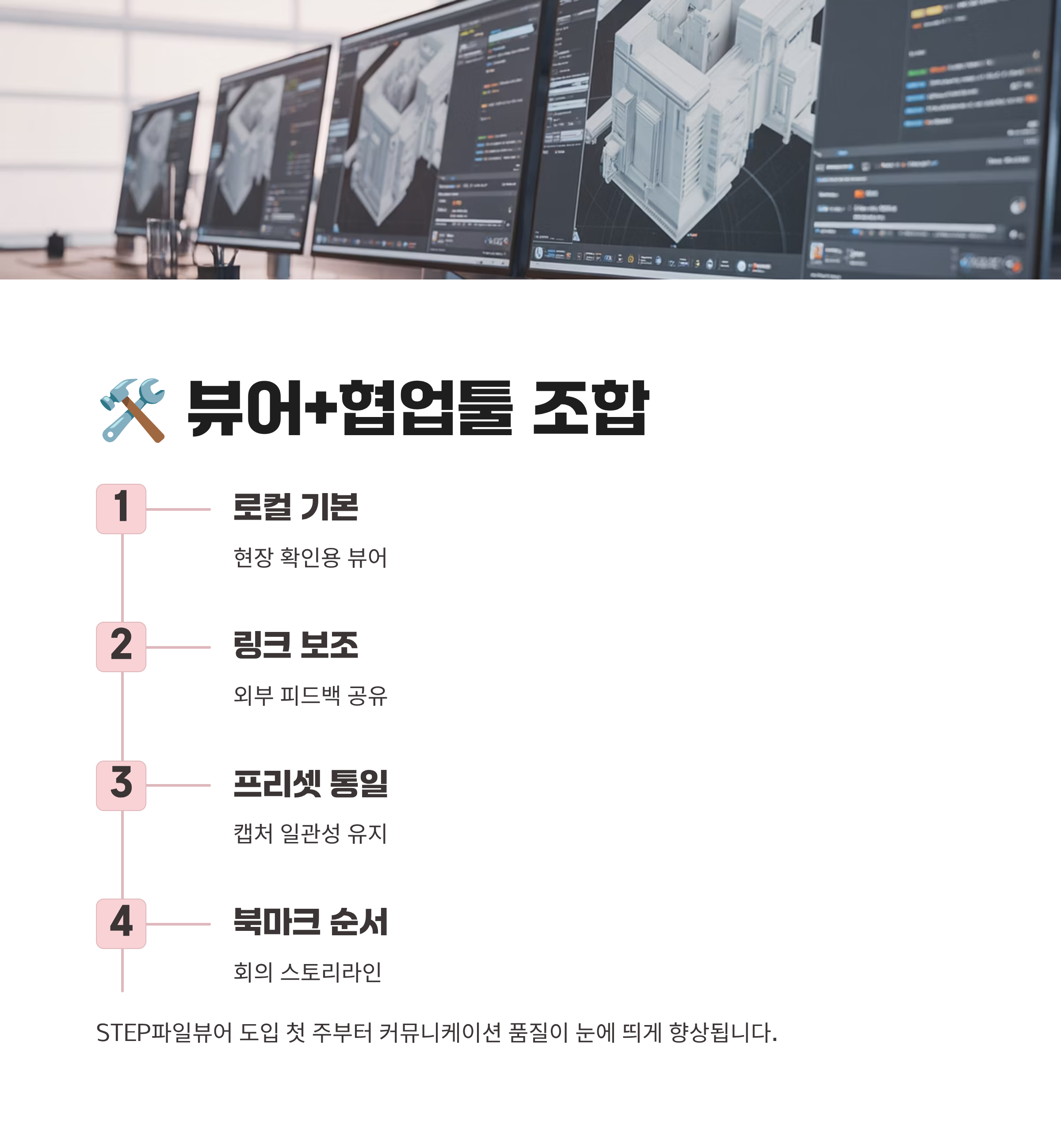회의 전에는 이슈 목록을 만들고, 장면 북마크를 순서대로 넘기는 스토리라인을 준비해두세요. 주석 색을 역할별로 나누면 피드백이 깔끔해요. 이런 루틴만 잡아도 STEP파일뷰어 도입 첫 주부터 커뮤니케이션 품질이 눈에 띄게 올라가요.