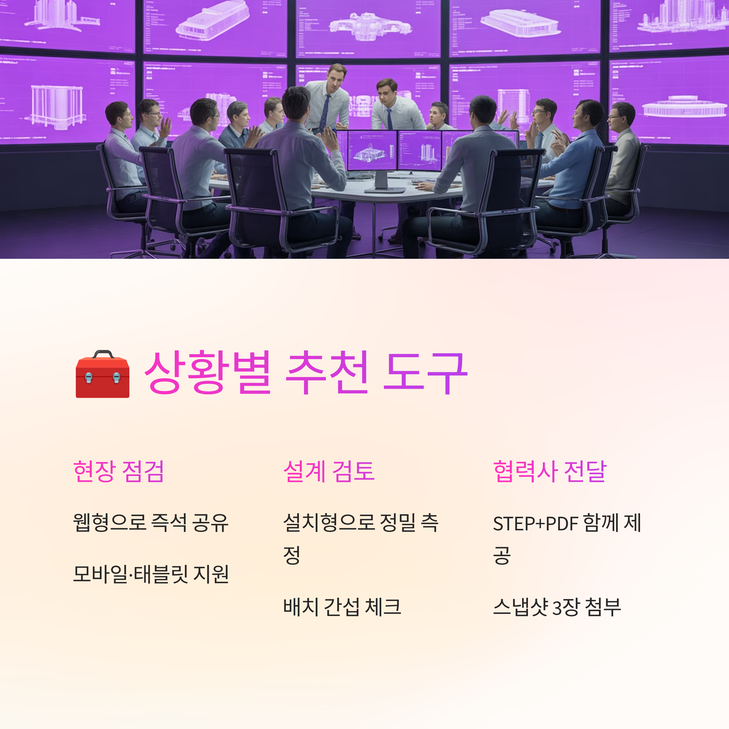 설계·품질팀 검토: 설치형이 안정적이에요. 대형 어셈, 정밀 측정, 배치 비교, 배치 간섭 같은 작업이 잦으면 GPU 가속과 로컬 캐시가 체감 속도를 올려줘요. 뷰 상태 프리셋을 만들어 부서별 체크 순서를 고정해요.