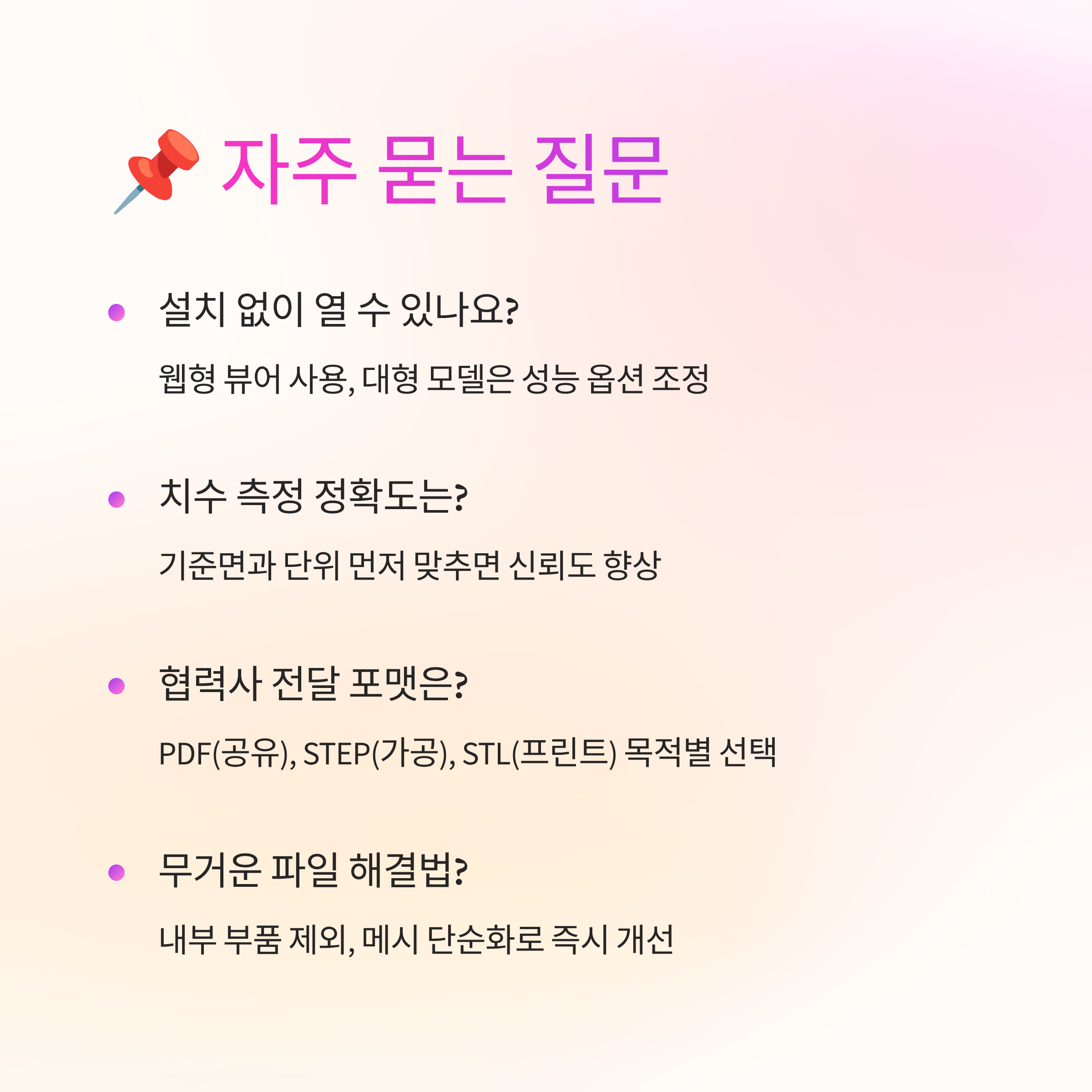 검토 기록은 캡처와 함께 남겨요. 각 이미지에 화살표·텍스트 주석을 넣고, 번호 체계로 정리하면 전달이 빨라요. 보고서 내보내기 때 파일명 규칙을 날짜_프로젝트_검토처럼 통일하고, 마지막 줄에 STP파일뷰어 작업 환경(GPU, 해상도)을 메모하면 재현성이 올라가요.