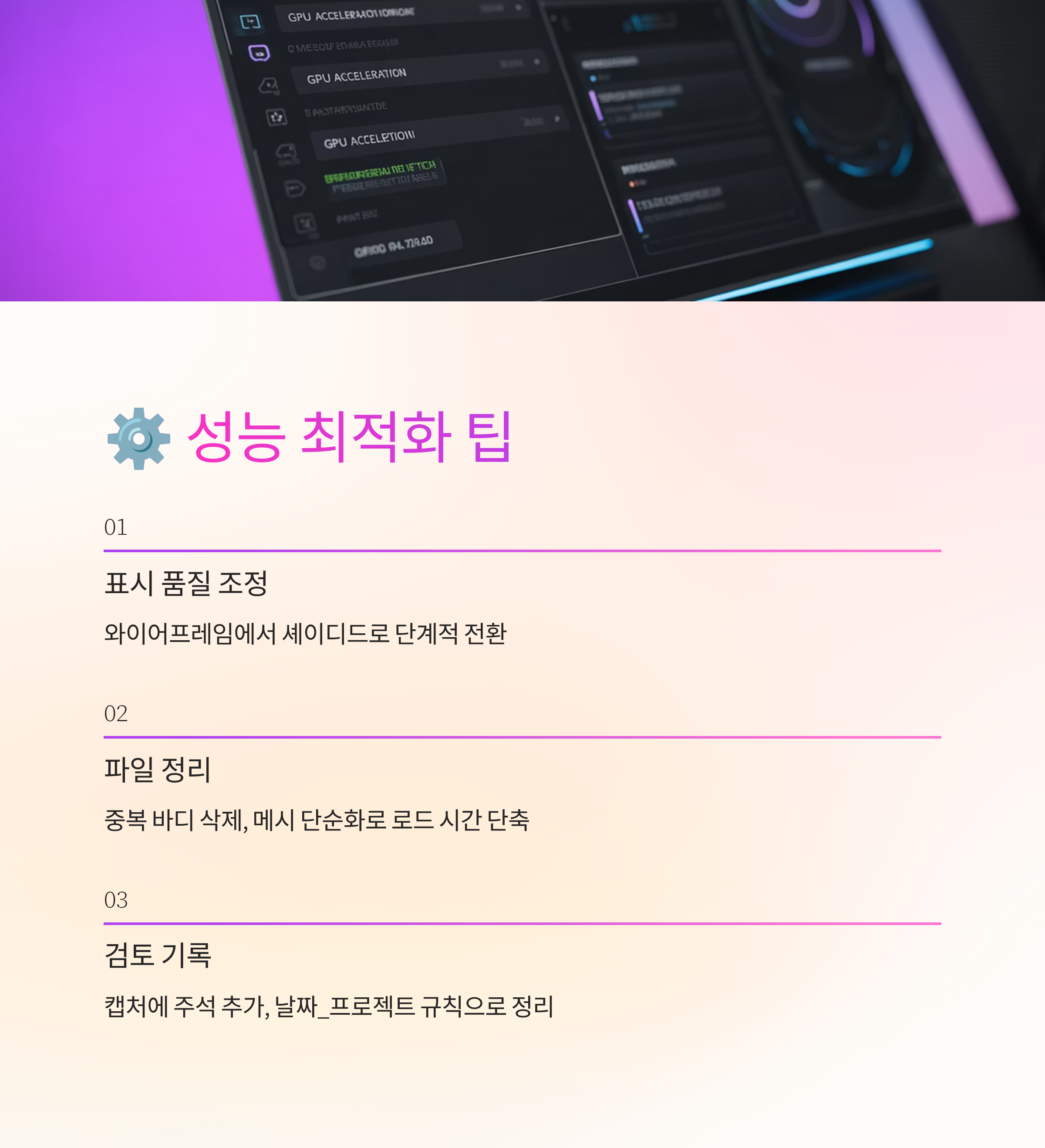 무거운 모델은 표시 품질과 그림자부터 내려요. 와이어프레임→셰이디드로 단계적으로 올리고, 필요할 때만 실시간 단면을 켜요. 숨겨진 부품 묶음은 레이어나 트리에서 그룹으로 접어두면 프레임이 안정돼요. 회전과 줌이 버벅이면 안티앨리어싱을 낮추고, GPU 가속을 확인해요.