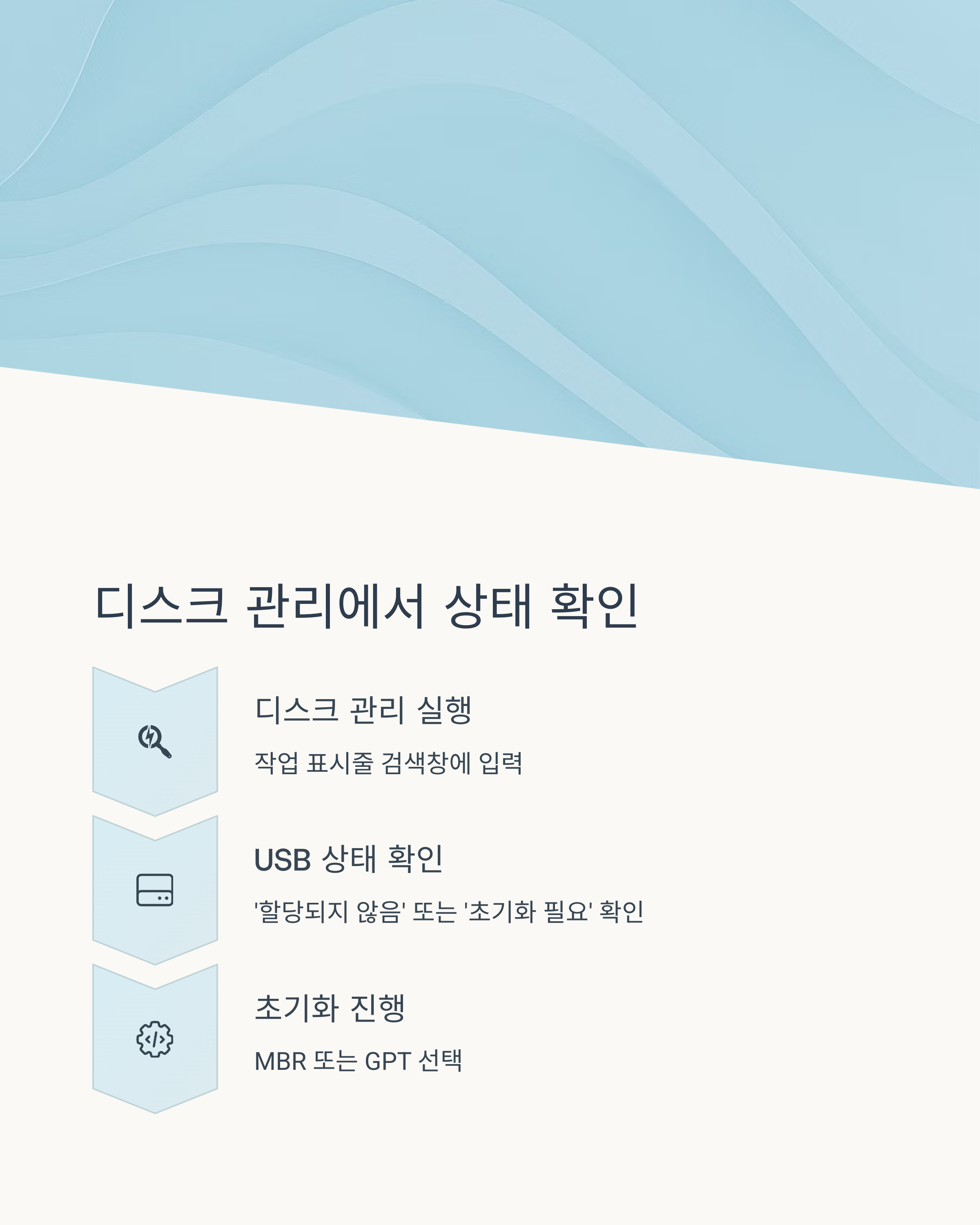 - USB 장치가 ‘할당되지 않음’ 또는 ‘초기화 필요’로 뜨는지 확인